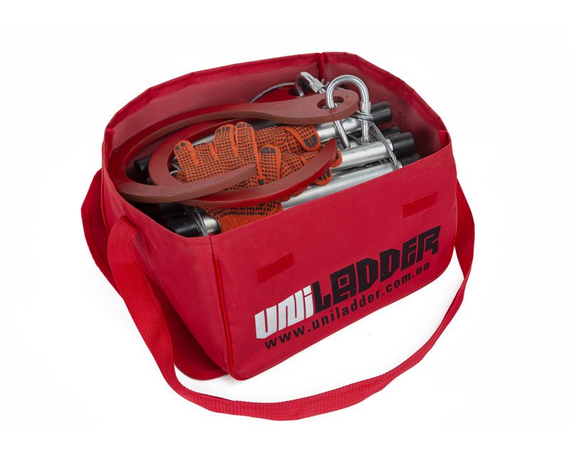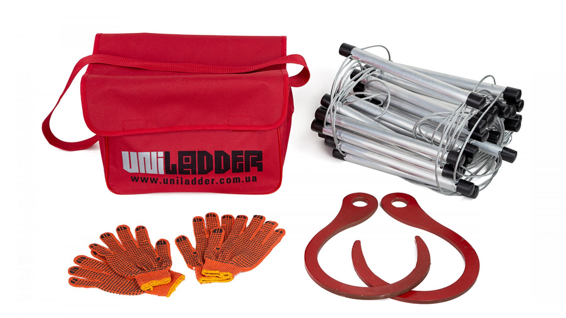 За основу взяты специальные кованые крюки, прикрепленные альпинистским карабином к десятиметровой, полностью железной лестнице, что позволяет проводить эвакуацию даже при самом сильном пожаре. Крюки дают надежную фиксацию лестницы будь то батарея, подоконник или же любой объект, который можно обмотать лестницей и зацепить крюками.